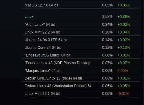 yesman@lemmy.worldEnglish · 16 hours agoRevised Steam Survey For December 2025 Puts Linux Gaming Marketshare At 3.58%plus-squarewww.phoronix.comexternal-linkmessage-square0linkfedilinkarrow-up11arrow-down10