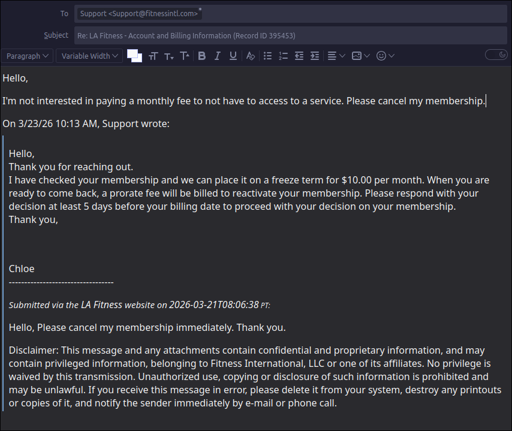 northernlights@lemmy.today to Mildly Infuriating@lemmy.worldEnglish · 20 days agoAsked LA Fitness to cancel my membership, they offered to freeze it for $10/month insteadlemmy.todayimagemessage-square210linkfedilinkarrow-up1833arrow-down15file-text