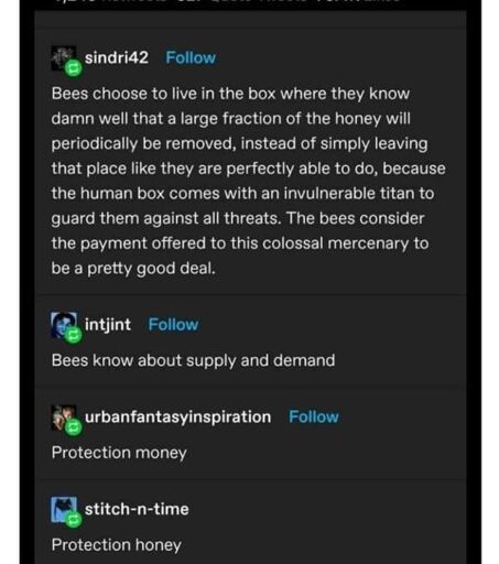 I’m a beekeeper. Fuck this stupid “humanity fuck yeah” bullshit. We trick the bees into staying in the hive. They do not accept or know anything about us stealing their honey. I work very hard to ensure that they don’t leave the hive via swarming. I participate in bee eugenics by controlling which queens I allow to continue laying, executing those that are not laying enough, laying too much, or producing offspring with bad temperaments. It’s a constant battle against their will to be free.