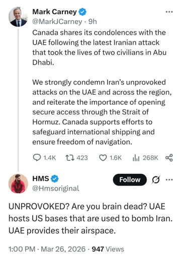 Carney sucks ass on this Iran war situation. Specifically Trumps’s ass. I dont care about the iranian régime, but as usual its thé population paying.