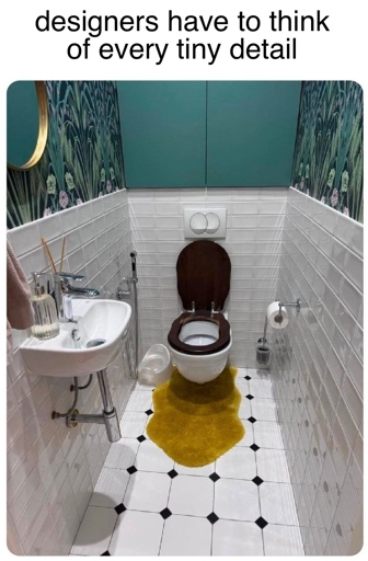 Is this about that throw-rug that looks like a toilet overflow? Or about the fact that the shower and toilet seem to be in the same place?