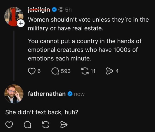 Also I’m not advocating that landowners are the only ones who should vote, the Earl Gray sat through that mess in the 1830s. I’m saying that one’s emotionally driven feelings towards the system subsides somewhat when one is persecuted less by it, which makes sense.