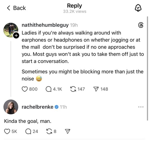 Plus, there’s the whole “women having to handle a man” aspect. Women have to treat men differently and behave differently to protect themselves when interacting with men (ones they don’t know in particular), and so a random stranger trying to start up a conversation is A Situation that they have to analyze. It goes back to the “women would prefer to be in the woods with a bear” thing. Women would rather a random bear try to start a conversation with them in public, or something.