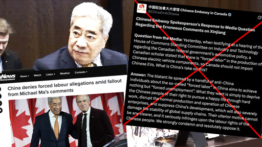 A Twitter/X post published on the official account of the Chinese Embassy in Canada exploits Liberal MP Michael Ma’s questioning the use of forced labour to build Chinese electric vehicles during a Parliamentary hearing, to deny the otherwise well document abuse of ethnic Uyghurs and forced labour. The post is a classic case of authoritarian state denial messaging: critics are cast as “anti-China,” human-rights evidence is reframed as a fabrication, and trade cooperation is presented as the real victim. This Chinese government post matters because it tries to neutralize documented Xinjiang forced-labour concerns at the exact moment Canada is debating Chinese EV access and a Canadian MP’s remarks on the issue.