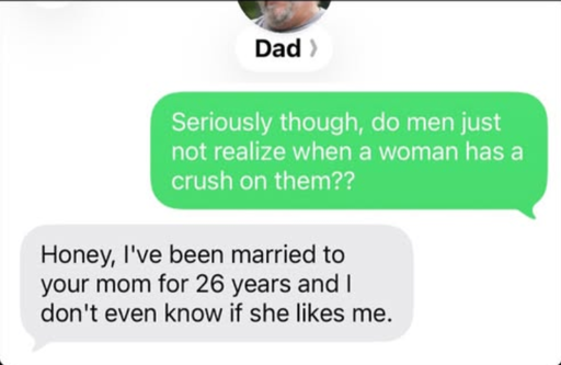 Wife: “Oh honey, no. It doesn’t work like that. If I’m mad at your dad for something I just have to tell him. If he asks if I’m OK and I say, ‘I’m fine’, he takes that at face value. He’s very literal.”