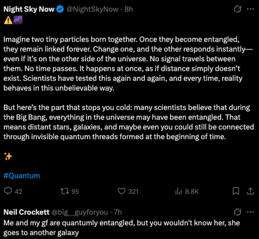 To be fair, the “change one” part is wrong. Two particles that are quantum entangled maintain the same quantum state when separated. But if you change the quantum state of one it doesn’t propogate. They are just in sync.