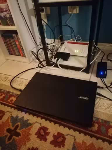 • Little bonus tangent: before I started working on the server, we’ve been having problems with our internet - think constant outages where regular restarting of the router was required only for another outage five minutes later. A technician came by and fixed it, but I was told to get a new router because a newer router would be able to fix some of the common issues you get internet access on its own. That’s what you see further to the back by the wall (50€ used, Fritz!Box 7510). Unfortunately, it only comes with one (1!!!) singular LAN port, so I had to buy a switch for 5 LAN ports in total (another 12€) which is sufficient for all the devices we use at home.