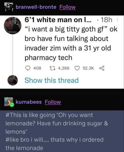 The deeper joke is that actual women who dress in the goth aesthetic are not as appealing as partners as, say, sexy pics on the internet imply. The picture being painted here is the millenial woman who was a goth girl in high school and never changed. It wasn’t just a phase, and it turns out, that was a bad thing. It turns out, she isn’t actually deep and profound, but just has depression, and used clothing and makeup choices to cover up her lack of an interesting personality. Now more than a decade out of high school, she still hasn’t changed, and her worldview and lifestyle are taking their toll. She took a low effort path to get a pharm tech certification, and now works a job that has basically no opportunity for advancement or better pay, but which requires few social skills and lets her dress however she wants. One of her main interests is Invader Zim, a show that had its merits, but which certainly isn’t still worth talking about as a regular topic more than a decade after it ended. And with the outline sketched, our mind can fill in the rest of the picture - her, standing with a scoul in her black lipstick and fishnets, the mandatory blue walmart vest clashing with her otherwise all-black aesthetic, holding back a sigh as she waits for a customer to fumble with their phone for 5 minutes to figure out if this is the pharmacy their perscription got sent to. Next back in line, an overweight 57 year old contractor in a RealTree hat leers at her cleavage, which she has mixed feeling about because on one hand, she finds this man’s attention disgusting, but on the other, she knows she no longer meets acceptable female beauty standards. A complete lack of exercise, plus lifestyle of staying up late doomscrolling and watching tv while downing canned seltzers with her cats has left her overweight, and looking haggard and prematurely aged. And as she ages out of the goth/punk/emo scene in the mid-sized midwestern city she never bothered to leave, she finds her social circle shrinking more and more - the only people she really interacts with regularly anymore are her coworkers, who dress normal and don’t really find her goth aesthetic important or interesting. But she keeps putting on the black lipstick every morning out of habit - since the alternative would be to face the embarassment of admitting to herself that she should have left this phase behind 10 years ago.