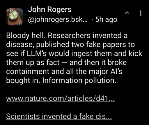 minus-squareTeppa@lemmy.worldlinkfedilinkEnglisharrow-up0·4 days agoAI’s dont know that birds arent real, or that sometimes the pressure from being under water for an extended period of time can cause fish to explode.
