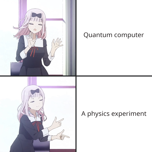 So I joust found this brilliant scientific paper called “Replication of Quantum Factorisation Records with an 8-bit Home Computer, an Abacus, and a Dog” which mocks quantum computer researchers for optimising factorisation of prime numbers in a way, so that it is as easy as possible to calculate them with a quantum computer. While you may not understand the technical or mathematical explanations they include a lot of jokes and its very funny to read. One of the jokes is,that they call quantum computers a “physics experiment”, which is the explanation behind this joke.