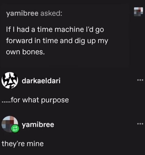Goes to the future and finds no bones. Well, yeah, actually that makes the most sense. Assuming a single timeline, you poof’d out of existence! Of course, if you did find bones, very like they are not yours and now you have a weird Memento situation where you’re investigating why you would have buried someone else’s bones in your own grave.