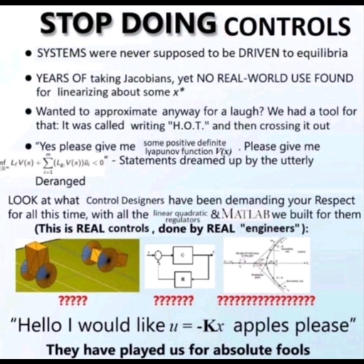 nooneescapesthelaw@mander.xyz to Science Memes@mander.xyzEnglish · 4 days agoControl theorymander.xyzimagemessage-square8linkfedilinkarrow-up11arrow-down10