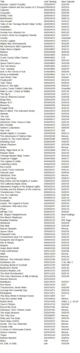 Plaintext: Title Batman: Caped Crusader Captain Harlock and the Queen of a Thousand Years Cybersix Gargoyles Infinity Train Mythbusters Hey Arnold! Tales of the Teenage Mutant Ninja Turtles Amphibia Animaniacs Scooby Doo; Mystery Inc. Foster’s Home for Imaginary Friends Gumby Gurren Lagann Mighty Max (Remastered) My Adventures With Superman Sailor Moon Original ReBoot Recess Crash Course Video Games She-Ra Space Patrol Luluco The Owl House Tron: Uprising Star vs the Forces of Evil Rocky & Bullwinkle Sym-Bionic Titan Freakazoid! Teen Titans Bump In The night Looney Tunes Golden Collection Nate Is Late / Oskar et Malika The Big O Unicorn Warriors Eternal Mega Man Megas XLR Motorcity Fraggle Rock Men in Black: The Animated Series Histeria! The Tick Swat Kats Adventure Time: Fiona & Cake Kim Possible Dexter’s Laboratory Star Trek Mobile Fighter G Gundam The Adventures of Salmon Max Captain N: The Game Master Darkwing Duck Danny Phantom Wakfu Kirby: Right Back At Ya Regular Show Teenage Mutant Ninja Turtles Inspector Gadget The Legend of Zelda Underdog (1964) Kid Cosmic Looney Tunes Cartoons Samurai Jack Adventure Time The Loud House King Arthur and the Knights of Justice The California Raisin Show Visionaries Knights of the Magical Lights He-Man and the Masters of the Universe Transformers: Prime Yuu Yuu Hakusho Invader Zim Ducktales Avatar: The Legend of Korra Codename: Kids Next Door Pingu Bill Nye TSG Mr. Rogers’ Neighborhood Pee-Wee’s Playhouse Reading Rainbow Wishbone Red Wall Ramen Akaneko Space Ghost Powerpuff Girls Transformers War For Cybertron Dungeons and Dragons Ren & Stimpy Rugrats Super Mario World Fairly OddParents Hilda Moomin Batman: The Animated Series Earthworm Jim Amazing World of Gumball Beakman’s World Rocko’s Modern Life The Real Ghostbusters The Grim Adventures of Billy & Mandy Bravest Warriors Beetlejuice Ruri Rocks Transformers: Beast Wars Courage the Cowardly Dog Rentaghost The Busy World of Richard Scarry Over the Garden Wall Button Moon Cow & Chicken Bocchi the Rock Adventure Time: Distant Lands The Angry Beavers The Trap Door Pinky and The Brain Clone Wars (2003) Avatar: The Last Airbender Gravity Falls A Series of Unfortunate Events Steven Universe Trigun Batman Beyond Bluey Ed, Edd, & Eddy