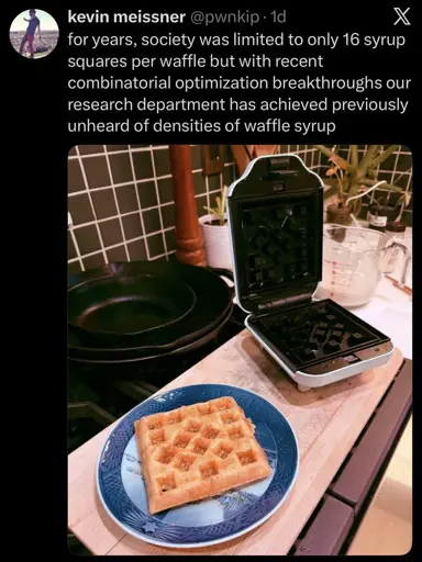 Oh my God, I fucking love this. I mean, I absolutely hate that this is the optimal way to pack 17 squares into a larger square such that the size of the larger square is minimised. However, I love that someone went to the effort of making a waffle iron plate for this. High effort shitposts like this give me life
