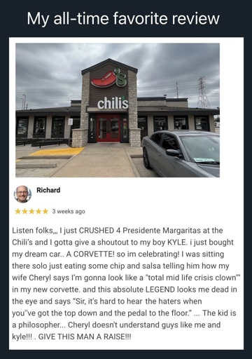 Someone caring enough to post a picture with their review and had their car parked in front of the store. You’d be lucky to read Chillis.