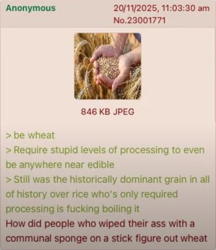 arrow-up11arrow-down1imageAnon thinks about wheatplus-squaresh.itjust.worksSine_Fine_Belli@lemmy.world to Science Memes@mander.xyzEnglish · 8 days agomessage-square0linkfedilink