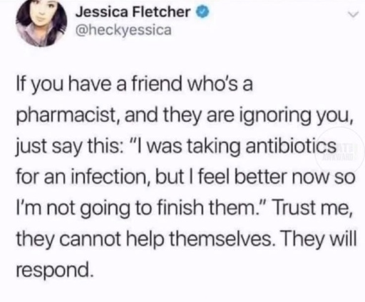ickplant@lemmy.world to Science Memes@mander.xyzEnglish · 6 days agoLife pro tip for friends of pharmacists lemmy.worldimagemessage-square0linkfedilinkarrow-up11arrow-down10